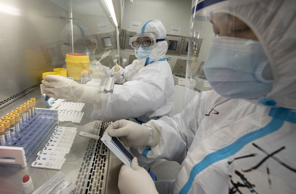 ↑3月4日,在武漢雷神山醫(yī)院醫(yī)學(xué)檢驗(yàn)科,工作人員在對(duì)患者的血液樣本進(jìn)行檢測。