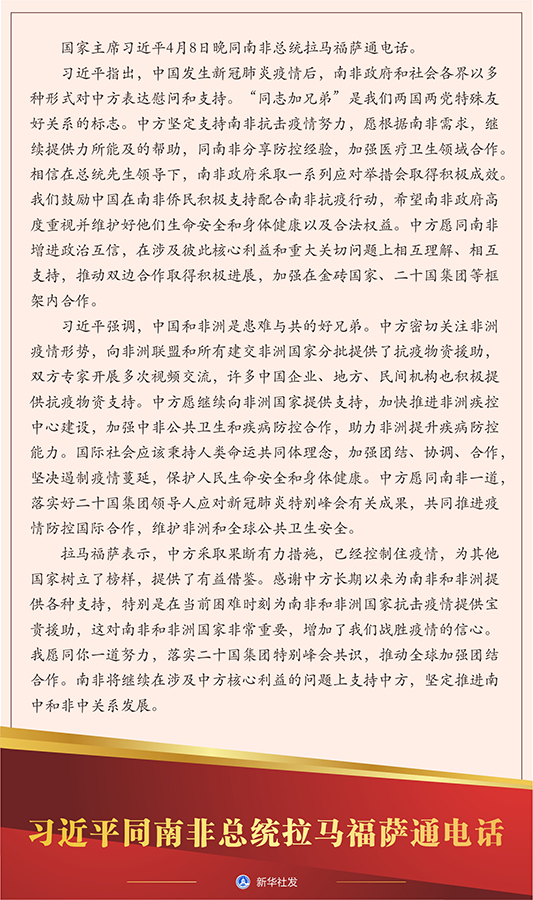習(xí)近平指出,中國發(fā)生新冠肺炎疫情后,南非政府和社會各界以多種形式對中方表達(dá)慰問和支持。“同志加兄弟”是我們兩國兩黨特殊友好關(guān)系的標(biāo)志。中方堅定支持南非抗擊疫情努力,愿根據(jù)南非需求,繼續(xù)提供力所能及的幫助,同南非分享防控經(jīng)驗,加強(qiáng)醫(yī)療衛(wèi)生領(lǐng)域合作。相信在總統(tǒng)先生領(lǐng)導(dǎo)下,南非政府采取一系列應(yīng)對舉措會取得積極成效。我們鼓勵中國在南非僑民積極支持配合南非抗疫行動,希望南非政府高度重視并維護(hù)好他們生命安全和身體健康以及合法權(quán)益。中方愿同南非增進(jìn)政治互信,在涉及彼此核心利益和重大關(guān)切問題上相互理解、相互支持,推動雙邊合作取得積極進(jìn)展,加強(qiáng)在金磚國家、二十國集團(tuán)等框架內(nèi)合作。