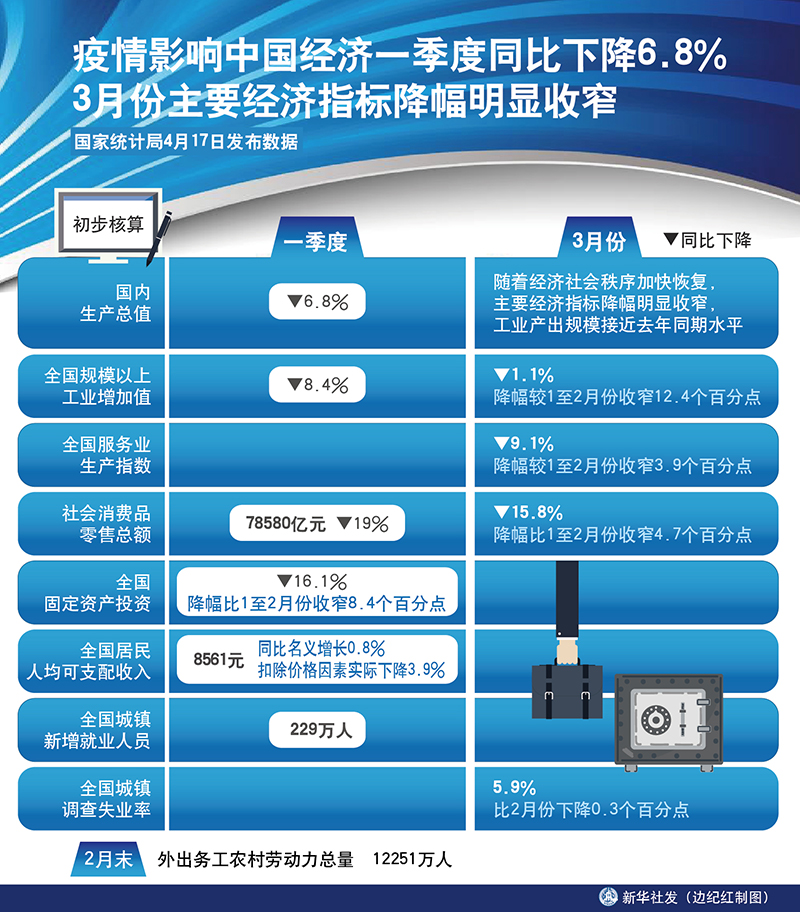 新華社北京4月17日電(記者陳煒偉、安蓓)國家統(tǒng)計局17日發(fā)布數據,初步核算,一季度國內生產總值同比下降6.8%。3月份,隨著經濟社會秩序加快恢復,主要經濟指標降幅明顯收窄,工業(yè)產出規(guī)模接近去年同期水平。