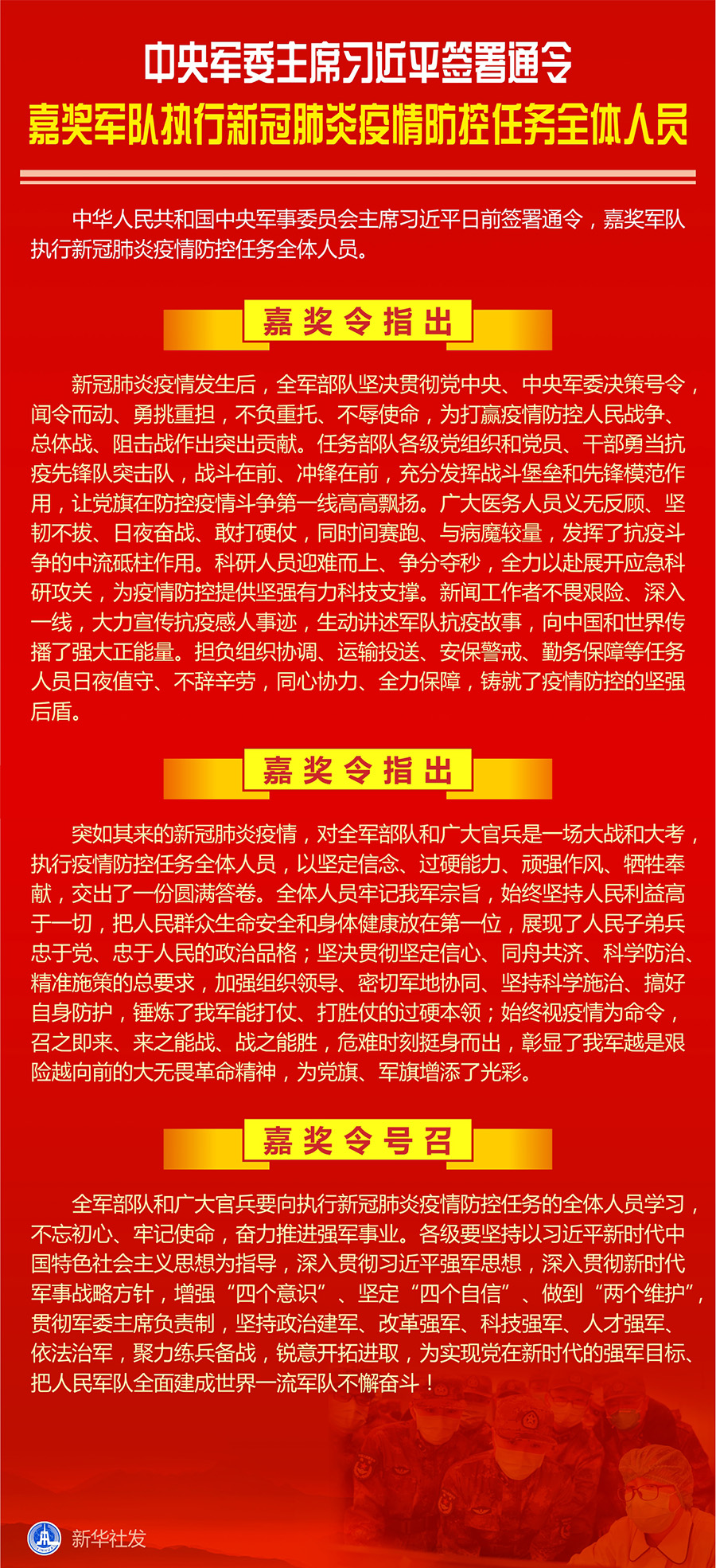 嘉獎(jiǎng)令號(hào)召,全軍部隊(duì)和廣大官兵要向執(zhí)行新冠肺炎疫情防控任務(wù)的全體人員學(xué)習(xí),不忘初心、牢記使命,奮力推進(jìn)強(qiáng)軍事業(yè)。各級(jí)要堅(jiān)持以習(xí)近平新時(shí)代中國特色社會(huì)主義思想為指導(dǎo),深入貫徹習(xí)近平強(qiáng)軍思想,深入貫徹新時(shí)代軍事戰(zhàn)略方針,增強(qiáng)“四個(gè)意識(shí)”、堅(jiān)定“四個(gè)自信”、做到“兩個(gè)維護(hù)”,貫徹軍委主席負(fù)責(zé)制,堅(jiān)持政治建軍、改革強(qiáng)軍、科技強(qiáng)軍、人才強(qiáng)軍、依法治軍,聚力練兵備戰(zhàn),銳意開拓進(jìn)取,為實(shí)現(xiàn)黨在新時(shí)代的強(qiáng)軍目標(biāo)、把人民軍隊(duì)全面建成世界一流軍隊(duì)不懈奮斗!