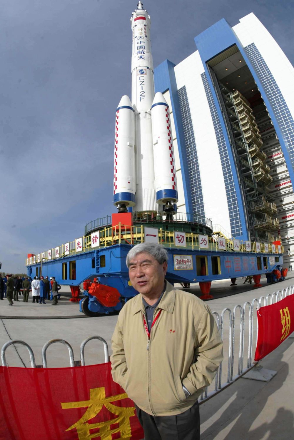 2003年10月16日,酒泉,戚發(fā)軔在“神舟”五號載人飛船前留影。新華社記者李剛攝