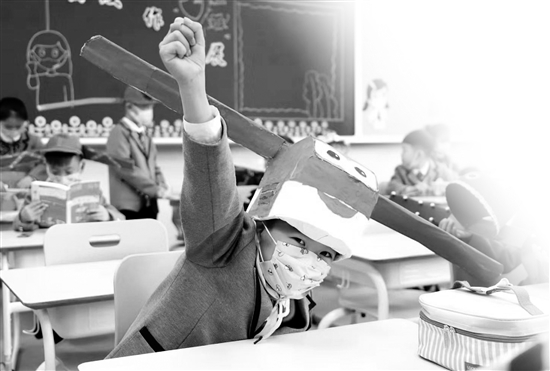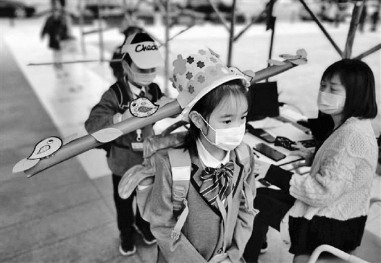 昨天上午8點,杭州養(yǎng)正小學(xué)終于迎來了小主人們,排隊、測溫、刷卡、消毒……特殊情況下,孩子們要通過重重關(guān)卡才能夠進入學(xué)校。此時從校門口經(jīng)過的路人們,發(fā)現(xiàn)這些萌娃有點特殊,除了佩戴防疫用的口罩,他們的頭上還戴著各式各樣的帽子,每一頂都很長很長。