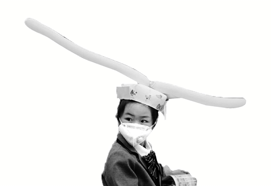 有的是在帽頂上粘了兩只棍子狀的氣球,從左右兩邊長長地伸了出去;有的是把動畫片《超級飛俠》的主角,一架叫“樂迪”的飛機戴在了頭上當帽子,兩側(cè)機翼展開,剛好一米長;還有的帽子左邊一只長頸鹿,右邊一只大象,脖子長加上鼻子長,也夠一米了;更多娃的帽子,像極了宋朝的官帽。