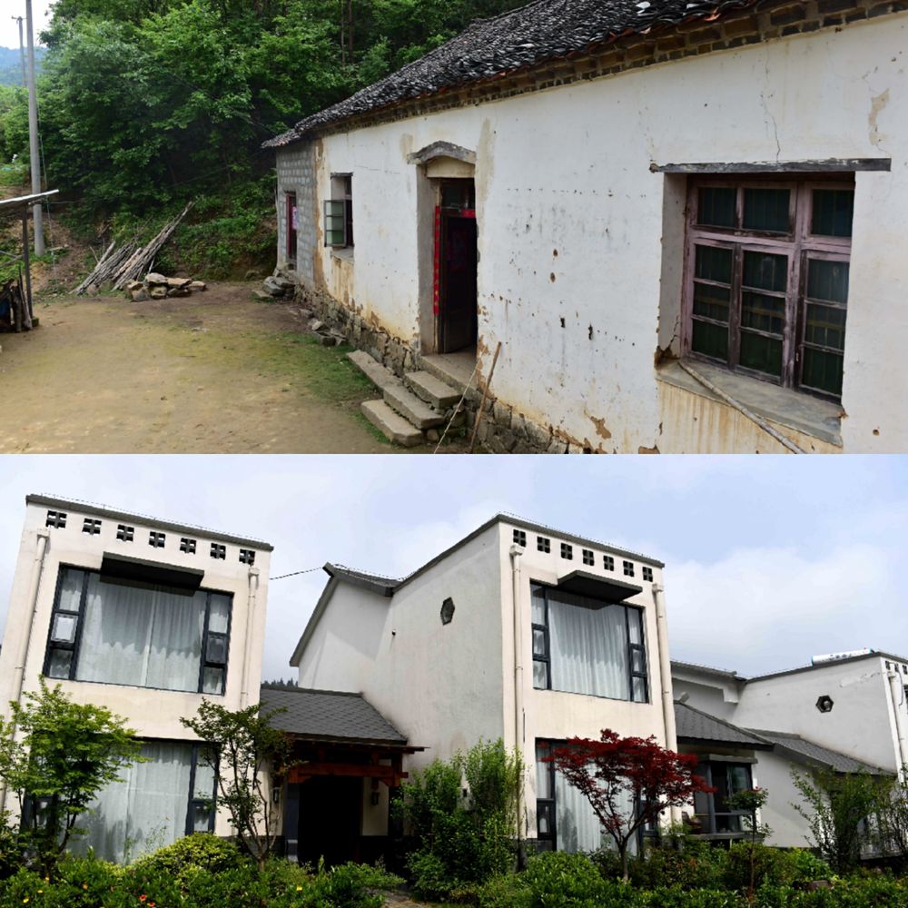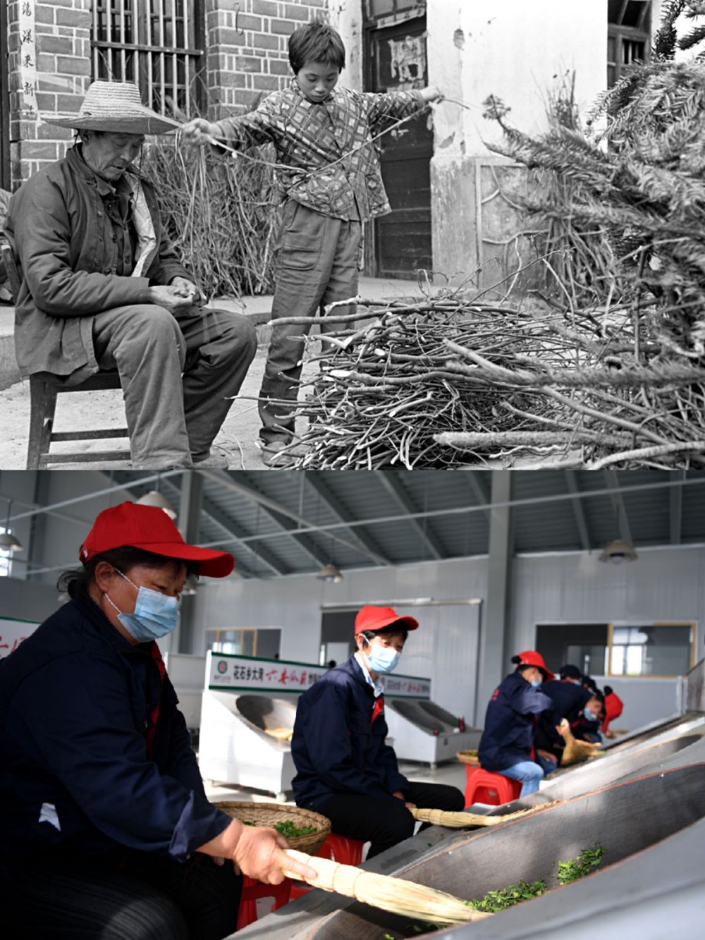 ?。ㄉ蠄D:過(guò)去金寨人守著柴火過(guò)日子,新華社記者張曙光攝;下圖:2020年4月16日,大灣村村民在金寨縣花石鄉(xiāng)茶產(chǎn)業(yè)扶貧車間里加工茶葉。新華社記者劉軍喜攝)
