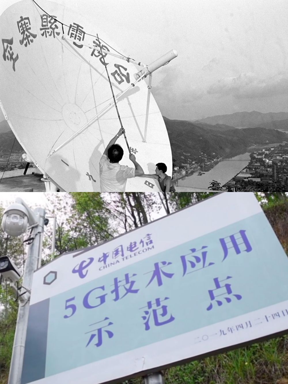 (上圖:1987年,金寨縣建成梅山地面衛(wèi)星接收站,新華社記者李錦攝;2019年,大灣村開(kāi)通5G信號(hào)。新華社記者湯陽(yáng)攝)