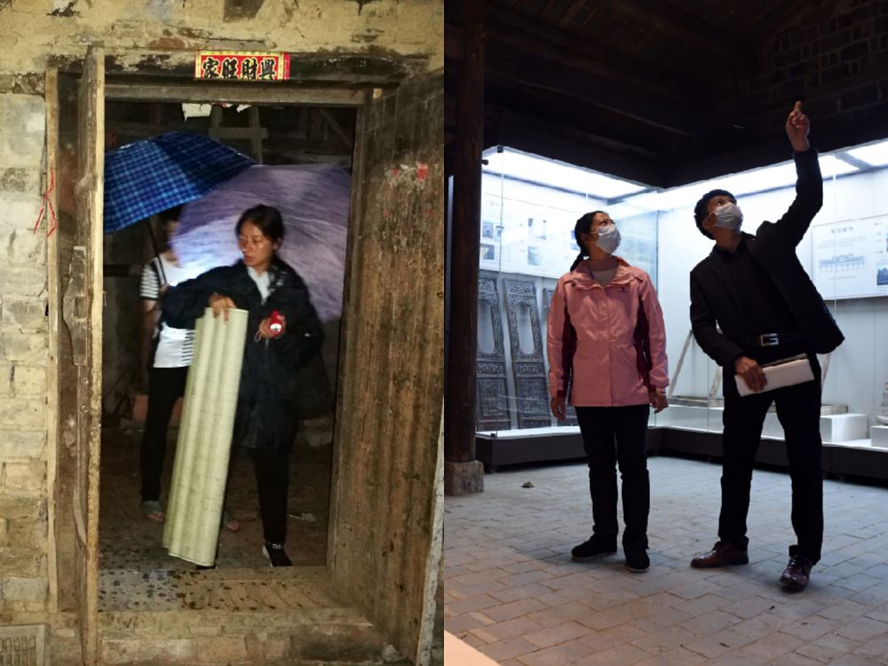(左圖:2017年7月的一場(chǎng)大暴雨中,大灣村第一書(shū)記余靜轉(zhuǎn)移危房中群眾,新華社記者陳諾攝;右圖:2020年3月19日,大灣村在建農(nóng)俗博物館內(nèi),余靜(左)和施工人員交流。新華社發(fā)周牧攝)
