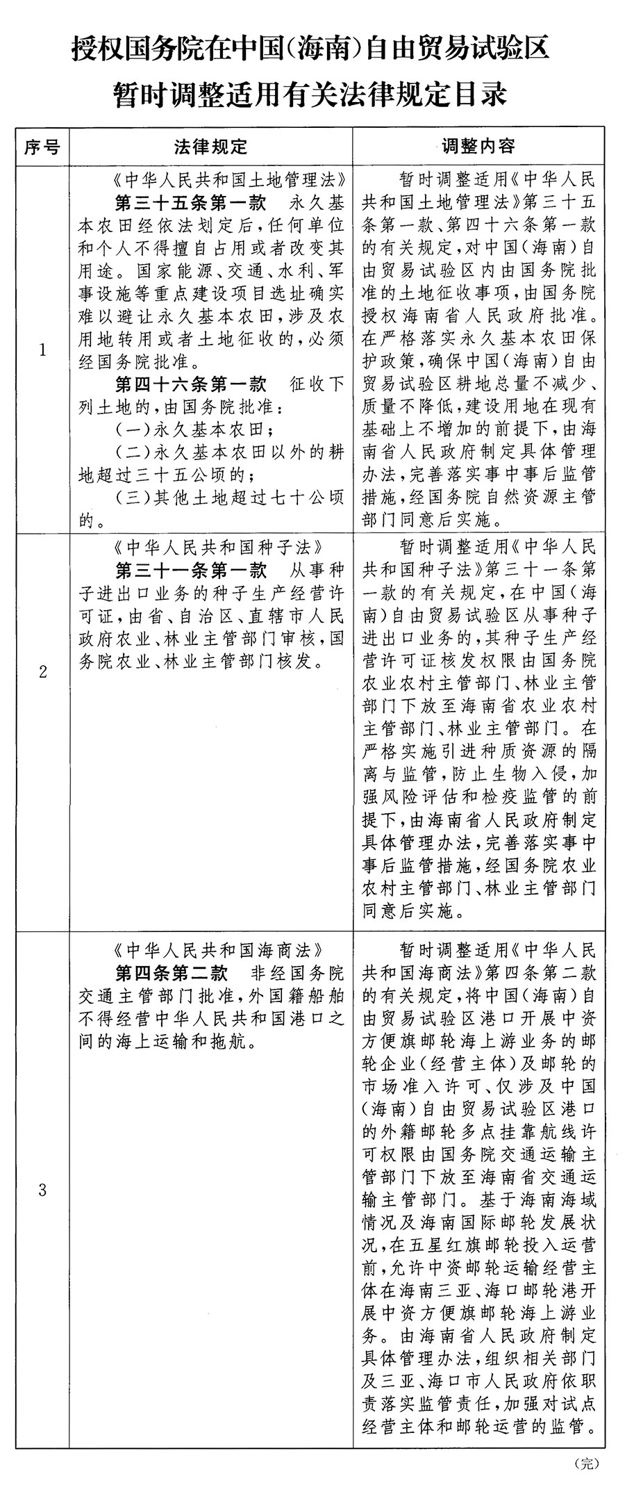 為支持海南全面深化改革開放,推動中國(海南)自由貿(mào)易試驗區(qū)試點政策落地,第十三屆全國人民代表大會常務委員會第十七次會議決定:授權(quán)國務院在中國(海南)自由貿(mào)易試驗區(qū)暫時調(diào)整適用《中華人民共和國土地管理法》《中華人民共和國種子法》《中華人民共和國海商法》的有關規(guī)定(目錄附后),暫時調(diào)整適用的期限至2024年12月31日。暫時調(diào)整適用有關法律規(guī)定,必須建立健全事中事后監(jiān)管制度,有效防控風險,國務院及其有關部門要加強指導、協(xié)調(diào)和監(jiān)督,及時總結(jié)試點工作經(jīng)驗,并就暫時調(diào)整適用有關法律規(guī)定的情況向全國人民代表大會常務委員會作出中期報告。對實踐證明可行的,修改完善有關法律;對實踐證明不宜調(diào)整的,恢復施行有關法律規(guī)定。
