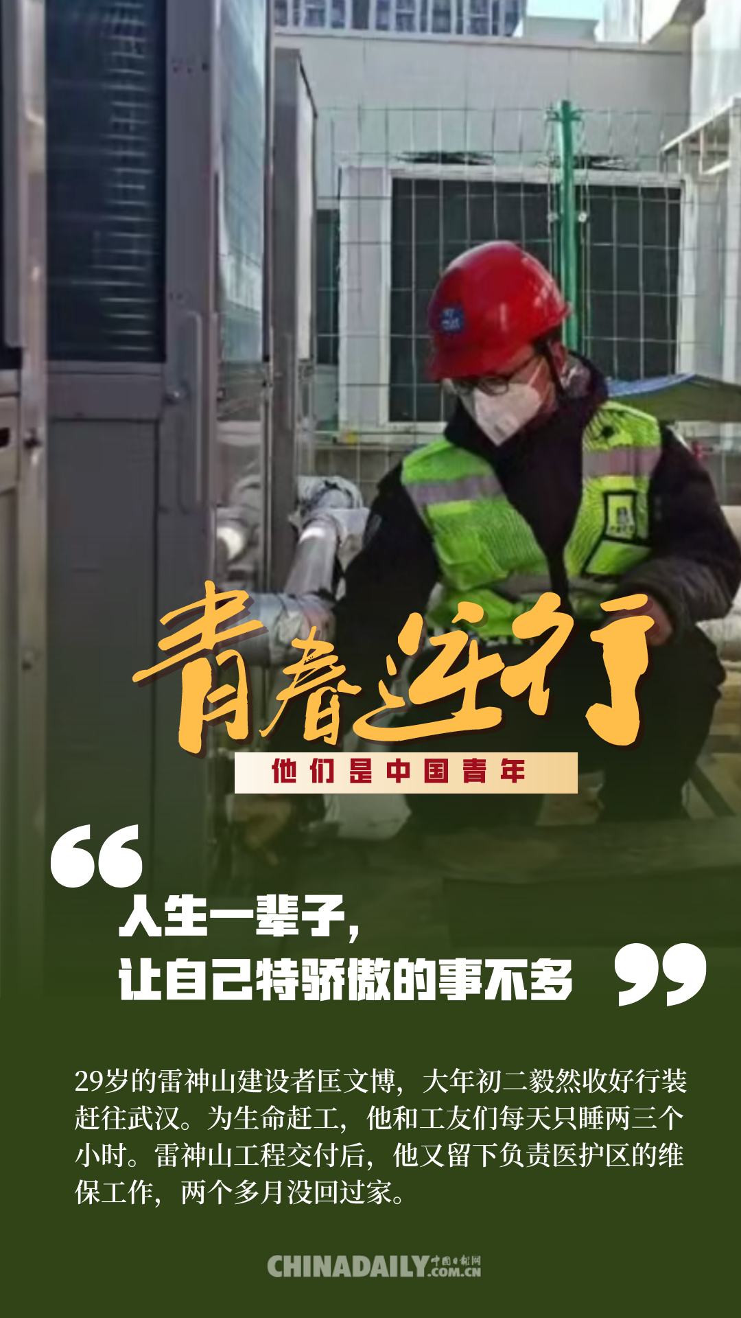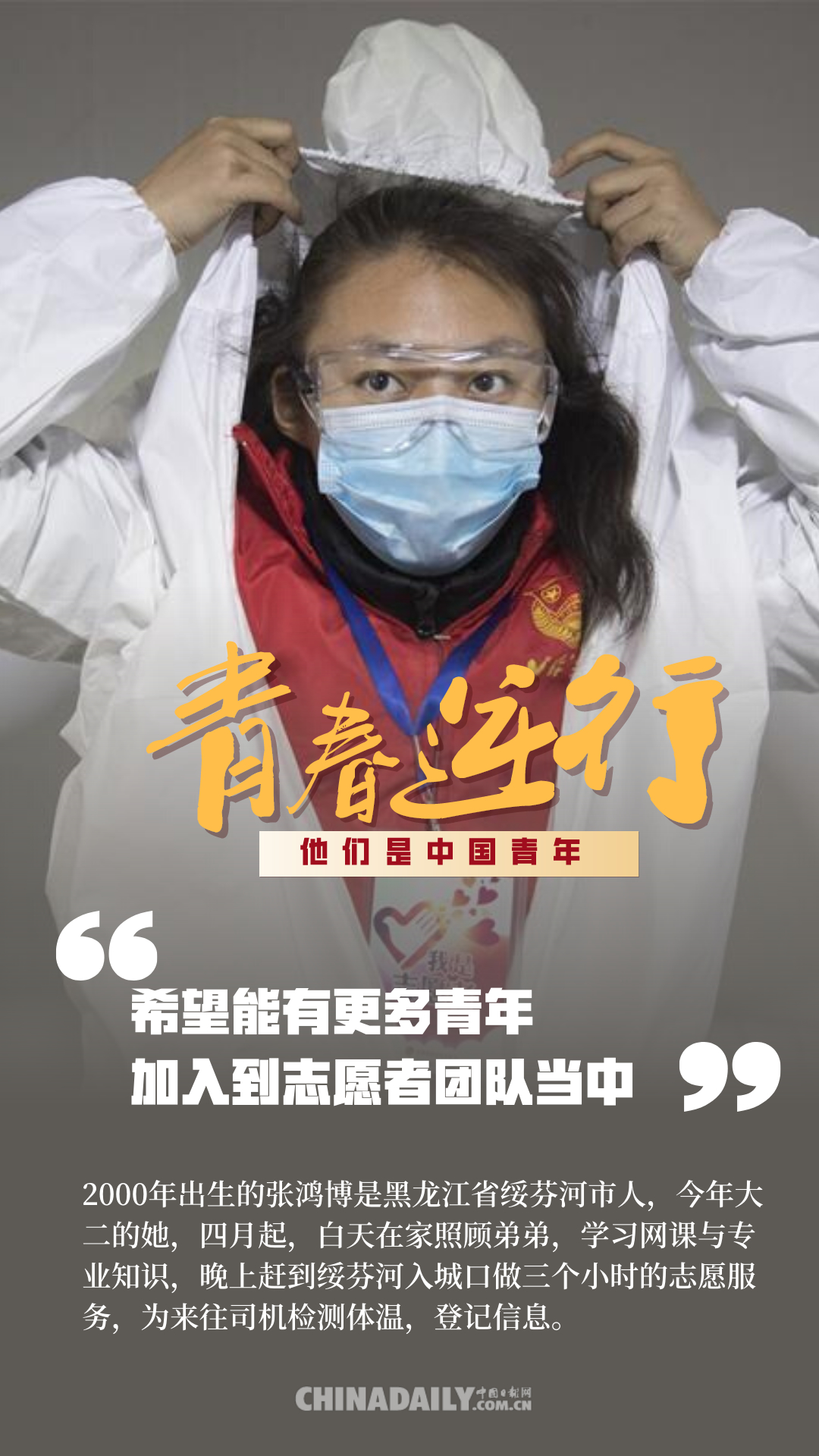 百年前,中國(guó)青年用春春和熱血,為祖國(guó)的前途命運(yùn)而抗?fàn)?;百年后,中?guó)青年秉承先輩精神,沖鋒在保衛(wèi)人民健康安全的戰(zhàn)疫前線。危機(jī)之時(shí),他們總是挺身而出,主動(dòng)申請(qǐng)到國(guó)家和人民最需要的地方去。在這場(chǎng)疫情防控阻擊戰(zhàn)中,4.2萬多名援鄂醫(yī)護(hù)人員里有1.2萬多名“90后”,還有一部分是“95后”“00后”,此外,在基建工人、公安干警、志愿者、網(wǎng)格員等抗“疫”隊(duì)伍里也有許多年輕的面孔,他們?cè)谝咔榉揽刂猩嵘?、迎難而上,為我們筑起了一道道鋼鐵長(zhǎng)城。這些人是當(dāng)代中國(guó)青年的縮影,他們用行動(dòng)證明,中國(guó)青年是堪當(dāng)大任的!