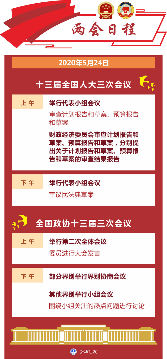 新華社北京5月23日電? 24日上午,十三屆全國人大三次會(huì)議舉行代表小組會(huì)議,審查計(jì)劃報(bào)告和草案、預(yù)算報(bào)告和草案;財(cái)政經(jīng)濟(jì)委員會(huì)審查計(jì)劃報(bào)告和草案、預(yù)算報(bào)告和草案,分別提出關(guān)于計(jì)劃報(bào)告和草案、預(yù)算報(bào)告和草案的審查結(jié)果報(bào)告。下午舉行代表小組會(huì)議,審議民法典草案。