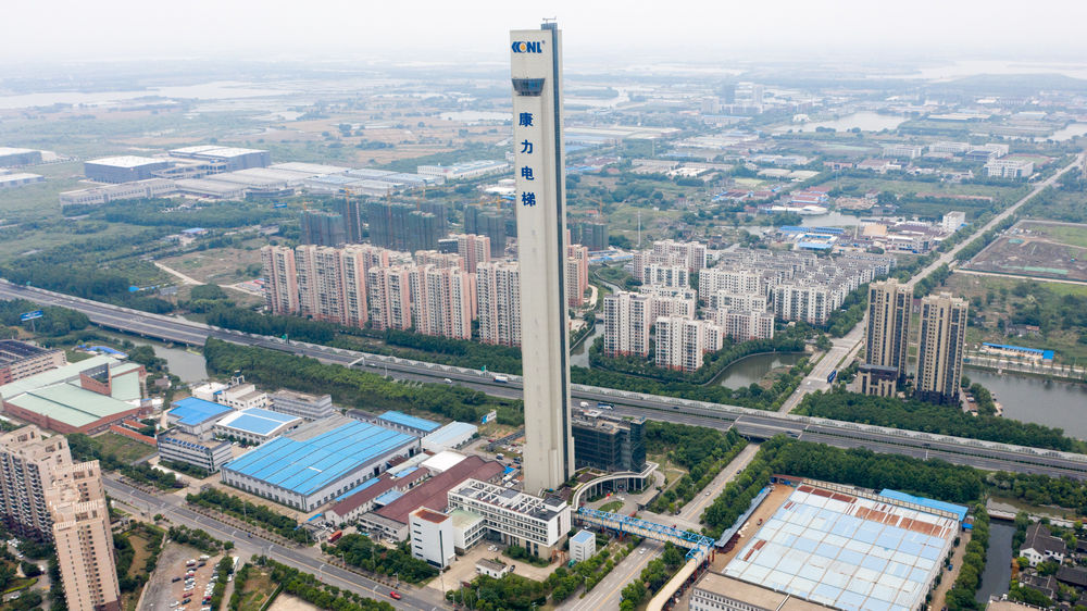 這是5月28日拍攝的江蘇蘇州市吳江區(qū)汾湖高新區(qū)的康力電梯試驗(yàn)塔(無(wú)人機(jī)照片)。新華社記者 李博 攝