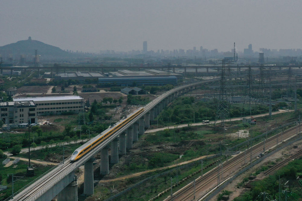 4月22日,在商合杭高鐵合肥至湖州段,聯(lián)調(diào)聯(lián)試綜合檢測(cè)列車經(jīng)過(guò)浙江湖州境內(nèi)(無(wú)人機(jī)照片)。新華社記者 黃宗治 攝