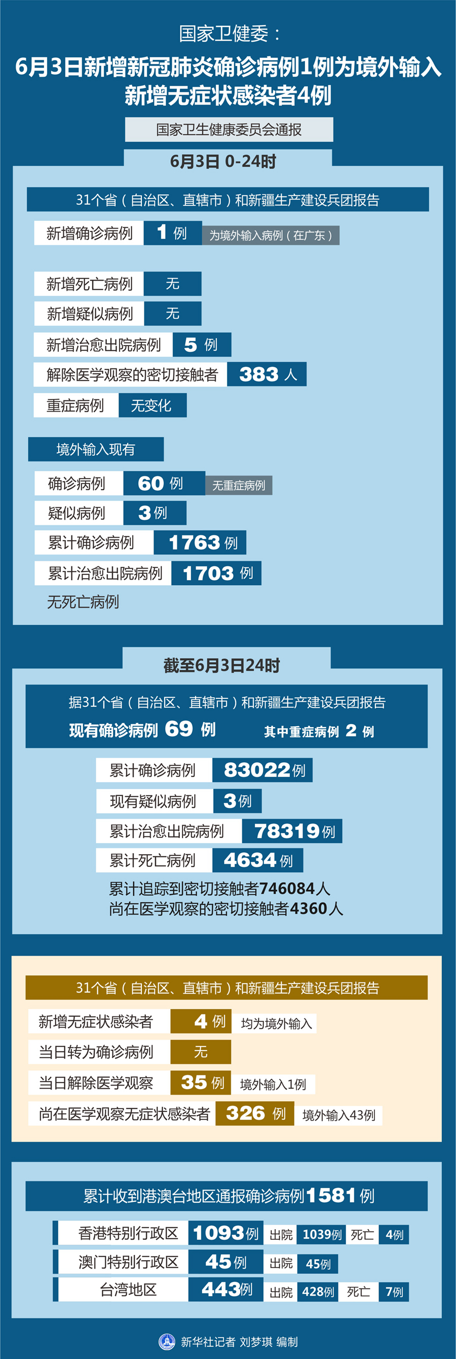 截至6月3日24時,據(jù)31個?。ㄗ灾螀^(qū)、直轄市)和新疆生產(chǎn)建設(shè)兵團報告,現(xiàn)有確診病例69例(其中重癥病例2例),累計治愈出院病例78319例,累計死亡病例4634例,累計報告確診病例83022例,現(xiàn)有疑似病例3例。累計追蹤到密切接觸者746084人,尚在醫(yī)學(xué)觀察的密切接觸者4360人。