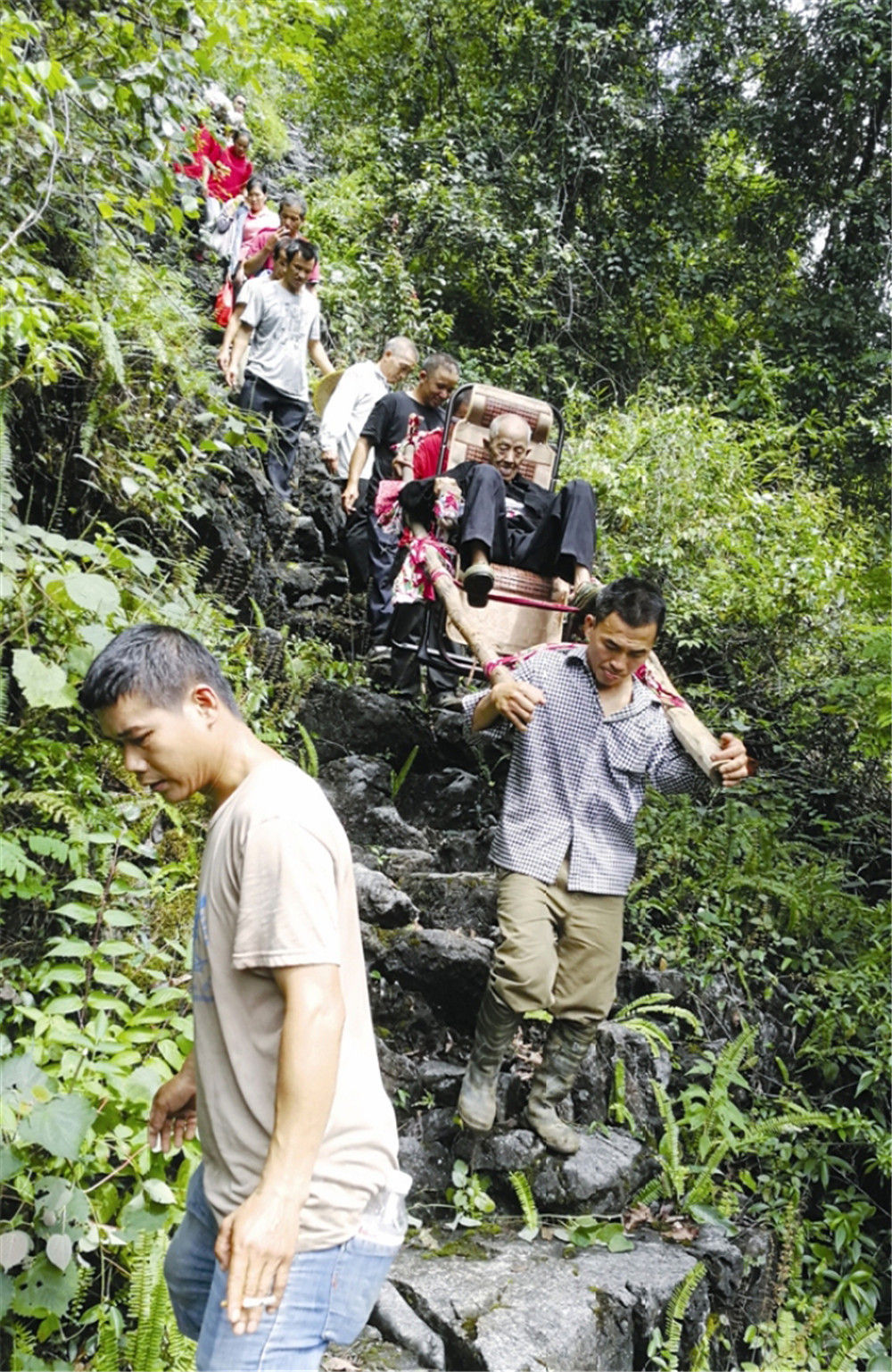 在廣西環(huán)江毛南族自治縣下南鄉(xiāng)下塘村,當(dāng)?shù)馗刹咳罕妼⒆T運(yùn)日老人抬下山(2019年9月11日攝)。新華社發(fā)(譚召關(guān) 攝)