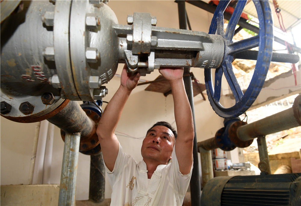 在廣西環(huán)江毛南族自治縣下南鄉(xiāng)抽水站,工作人員在檢查設(shè)備(5月22日攝)。新華社記者 陸波岸 攝
