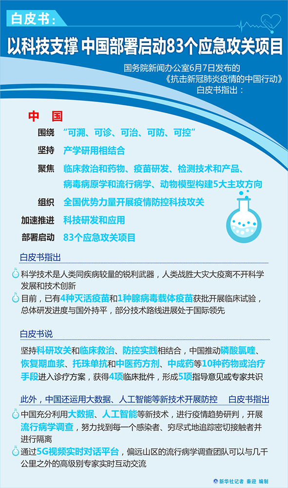 新華社北京6月7日電(記者胡喆)國務(wù)院新聞辦公室7日發(fā)布的《抗擊新冠肺炎疫情的中國行動》白皮書指出,中國圍繞“可溯、可診、可治、可防、可控”,堅持產(chǎn)學(xué)研用相結(jié)合,聚焦臨床救治和藥物、疫苗研發(fā)、檢測技術(shù)和產(chǎn)品、病毒病原學(xué)和流行病學(xué)、動物模型構(gòu)建5大主攻方向,組織全國優(yōu)勢力量開展疫情防控科技攻關(guān),加速推進科技研發(fā)和應(yīng)用,部署啟動83個應(yīng)急攻關(guān)項目。