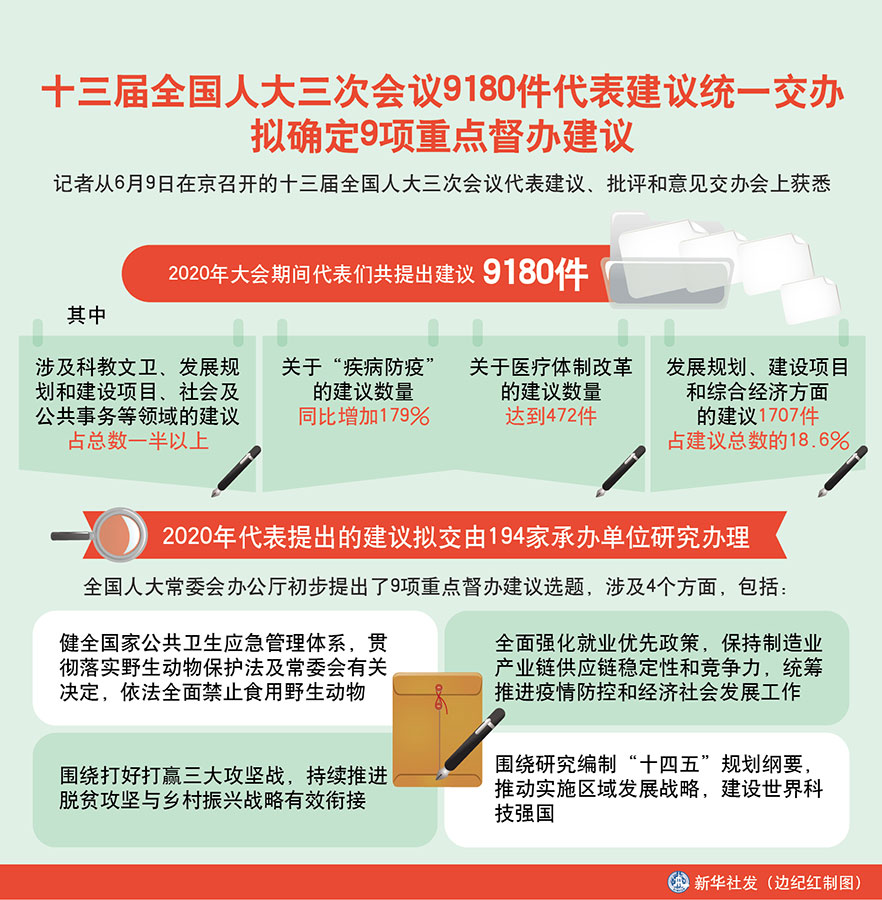 按照代表法有關規(guī)定,今年代表提出的建議擬交由194家承辦單位研究辦理。全國人大常委會辦公廳初步提出了9項重點督辦建議選題,涉及4個方面,包括:健全國家公共衛(wèi)生應急管理體系,貫徹落實野生動物保護法及常委會有關決定,依法全面禁止食用野生動物;全面強化就業(yè)優(yōu)先政策,保持制造業(yè)產(chǎn)業(yè)鏈供應鏈穩(wěn)定性和競爭力,統(tǒng)籌推進疫情防控和經(jīng)濟社會發(fā)展工作;圍繞打好打贏三大攻堅戰(zhàn),持續(xù)推進脫貧攻堅與鄉(xiāng)村振興戰(zhàn)略有效銜接;圍繞研究編制“十四五”規(guī)劃綱要,推動實施區(qū)域發(fā)展戰(zhàn)略,建設世界科技強國。