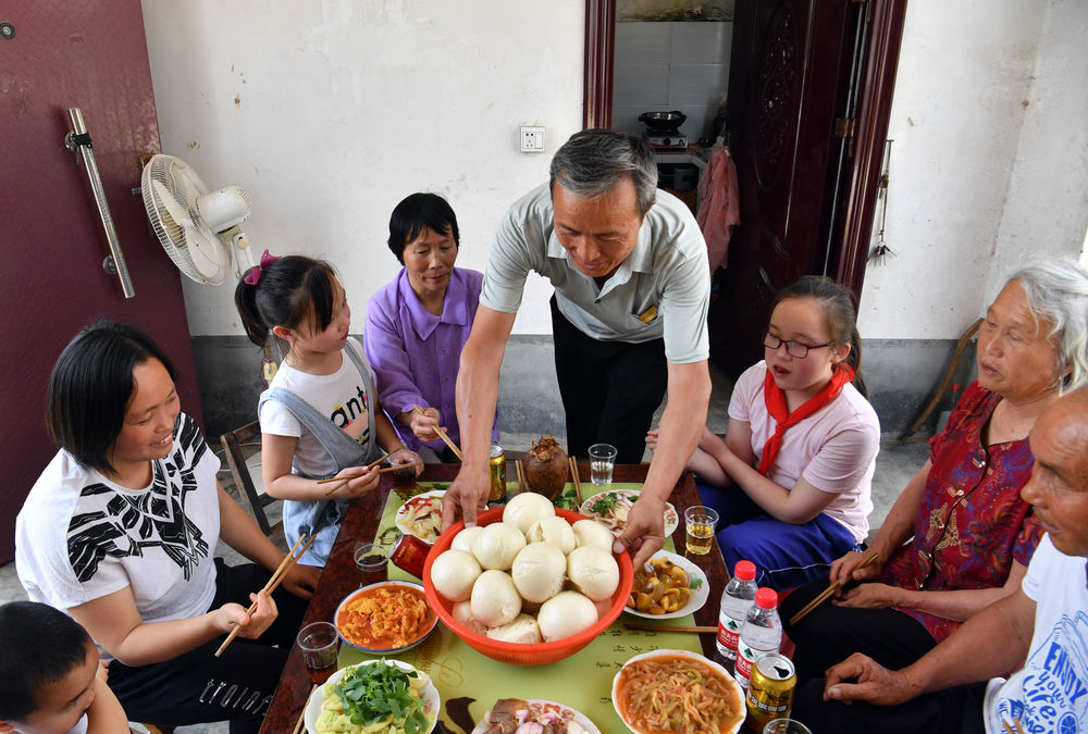 在河南省新蔡縣獅子口村,村民時中龍一家在吃午飯(5月28日攝)。新華社記者 李嘉南 攝