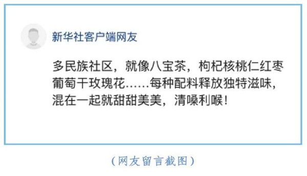 還有網(wǎng)友以寧夏著名的八寶茶來形容各民族團結(jié)和諧的景象——各種配料搭在一起,才能有滋有味。缺哪一樣,都少點“茶味”。