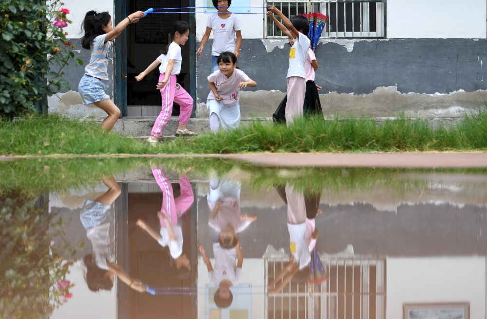 ↑?小思揚(前左三)在課間和同學(xué)一起玩耍。
