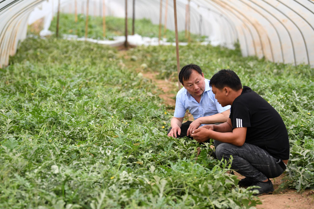 ↑?鄭加衛(wèi)(左)在汪李村的一家瓜果種植基地里走訪。