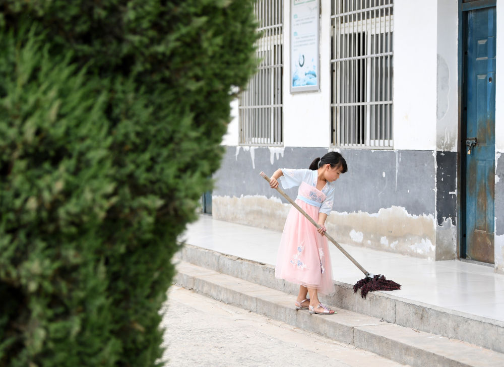 ↑?小思揚放學(xué)后在校園里打掃衛(wèi)生。