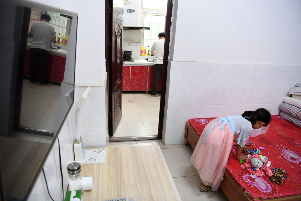 ↑?小思揚在宿舍里玩耍,鄭加衛(wèi)在準備晚飯。