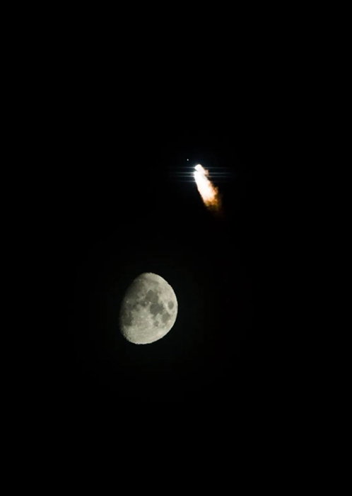 2015年3月30日,搭載首顆新一代北斗導(dǎo)航衛(wèi)星的長(zhǎng)征三號(hào)丙運(yùn)載火箭在西昌衛(wèi)星發(fā)射中心點(diǎn)火發(fā)射,火箭升空后與明月交相輝映。新華社記者 白禹 攝