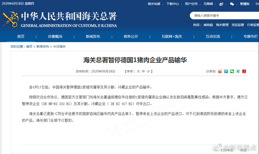 海關(guān)總署18日發(fā)布公告,自6月17日起,中國海關(guān)暫停德國一家豬肉屠宰及其分割、冷藏企業(yè)的產(chǎn)品輸華。按照雙邊合作協(xié)議,德國官方主管部門向海關(guān)總署通報(bào)德在華注冊的一家豬肉屠宰企業(yè)確認(rèn)發(fā)生新冠病毒聚集性感染。根據(jù)中方要求,德方已暫停該企業(yè)及其分割、冷藏企業(yè)對華出口。海關(guān)總署已更新《符合評估要求的國家或地區(qū)輸華肉類產(chǎn)品名單》,暫停來自上述企業(yè)的產(chǎn)品進(jìn)口。對于已到港或即將到港的來自上述企業(yè)的產(chǎn)品,海關(guān)部門全部予以暫扣。(記者劉紅霞)
