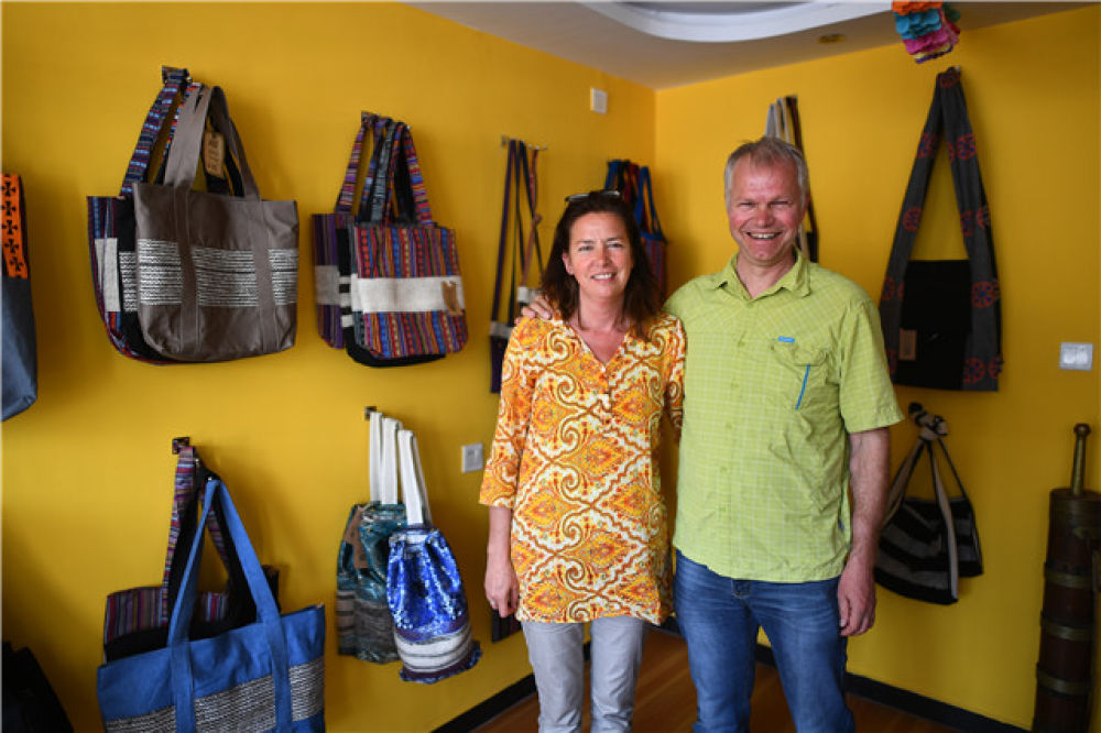 在青海省西寧市,安鵬(右)和妻子在自己的手工藝品店合影(2019年4月18日攝)。新華社記者 張宏祥 攝