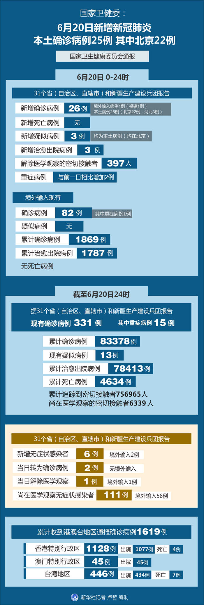 新華社北京6月21日電(記者陳聰)據(jù)國家衛(wèi)生健康委員會21日通報,6月20日0—24時,31個省(自治區(qū)、直轄市)和新疆生產(chǎn)建設(shè)兵團(tuán)報告新增新冠肺炎確診病例26例,其中境外輸入病例1例(在福建),本土病例25例(北京22例,河北3例);無新增死亡病例;新增疑似病例3例,均為本土病例(均在北京)。