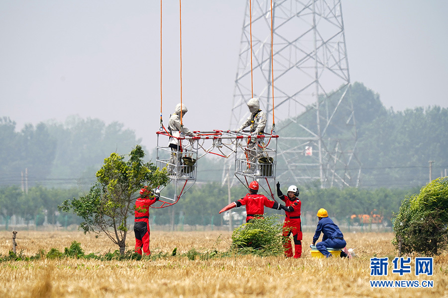 6月18日,直升機準備用吊籃把兩名檢修人員“吊”到有缺陷的特高壓線路上。 新華社記者范世輝 攝(資料圖)