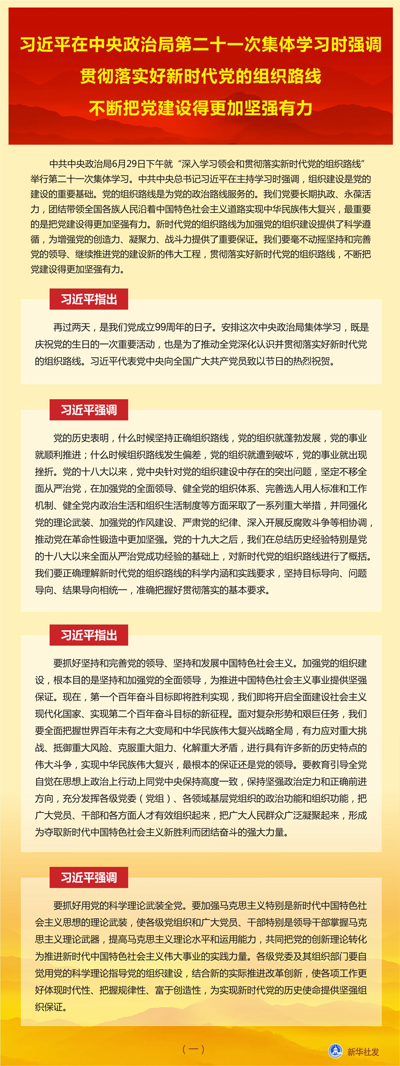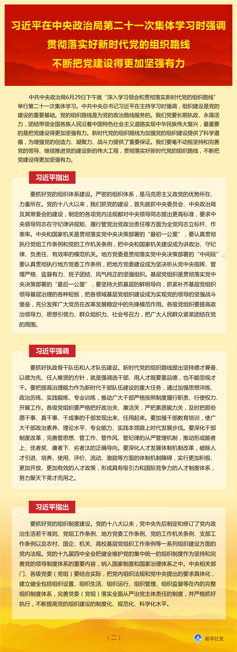 新華社北京6月30日電 中共中央政治局6月29日下午就“深入學(xué)習(xí)領(lǐng)會(huì)和貫徹落實(shí)新時(shí)代黨的組織路線”舉行第二十一次集體學(xué)習(xí)。中共中央總書記習(xí)近平在主持學(xué)習(xí)時(shí)強(qiáng)調(diào),組織建設(shè)是黨的建設(shè)的重要基礎(chǔ)。黨的組織路線是為黨的政治路線服務(wù)的。我們黨要長(zhǎng)期執(zhí)政、永葆活力,團(tuán)結(jié)帶領(lǐng)全國(guó)各族人民沿著中國(guó)特色社會(huì)主義道路實(shí)現(xiàn)中華民族偉大復(fù)興,最重要的是把黨建設(shè)得更加堅(jiān)強(qiáng)有力。新時(shí)代黨的組織路線為加強(qiáng)黨的組織建設(shè)提供了科學(xué)遵循,為增強(qiáng)黨的創(chuàng)造力、凝聚力、戰(zhàn)斗力提供了重要保證。我們要毫不動(dòng)搖堅(jiān)持和完善黨的領(lǐng)導(dǎo)、繼續(xù)推進(jìn)黨的建設(shè)新的偉大工程,貫徹落實(shí)好新時(shí)代黨的組織路線,不斷把黨建設(shè)得更加堅(jiān)強(qiáng)有力。