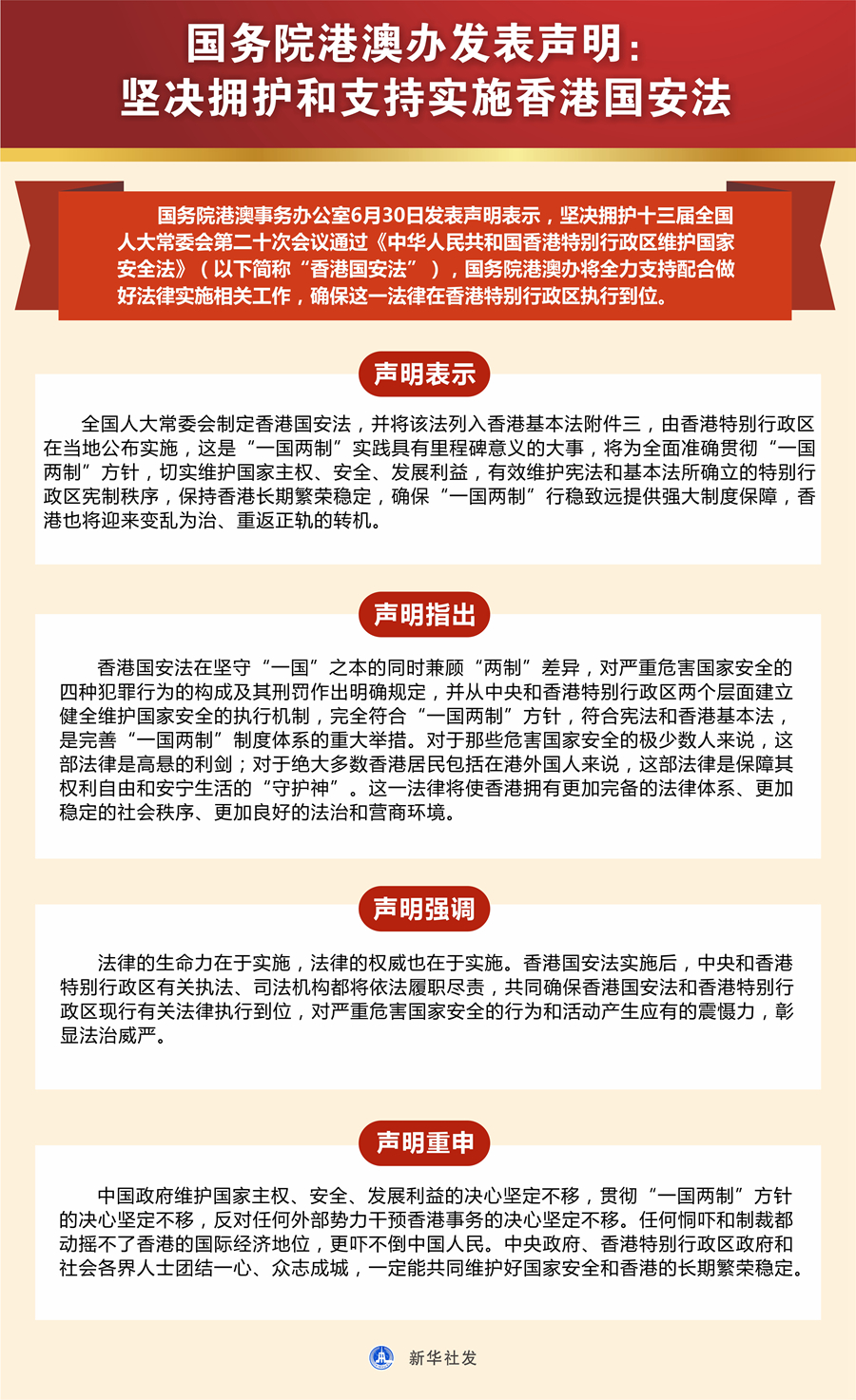 聲明表示,全國人大常委會制定香港國安法,并將該法列入香港基本法附件三,由香港特別行政區(qū)在當?shù)毓紝嵤?,這是“一國兩制”實踐具有里程碑意義的大事,將為全面準確貫徹“一國兩制”方針,切實維護國家主權、安全、發(fā)展利益,有效維護憲法和基本法所確立的特別行政區(qū)憲制秩序,保持香港長期繁榮穩(wěn)定,確保“一國兩制”行穩(wěn)致遠提供強大制度保障,香港也將迎來變亂為治、重返正軌的轉(zhuǎn)機。