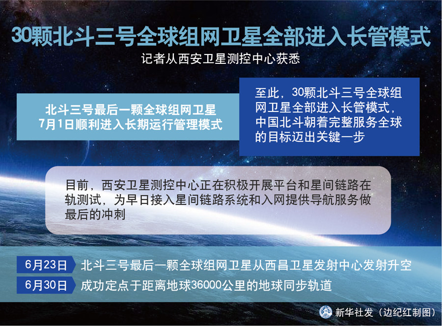 新華社西安7月1日電(李國利、徐新芳)記者從西安衛(wèi)星測控中心獲悉,北斗三號最后一顆全球組網(wǎng)衛(wèi)星1日順利進(jìn)入長期運行管理模式,至此,30顆北斗三號全球組網(wǎng)衛(wèi)星全部進(jìn)入長管模式,中國北斗朝著完整服務(wù)全球的目標(biāo)邁出關(guān)鍵一步。