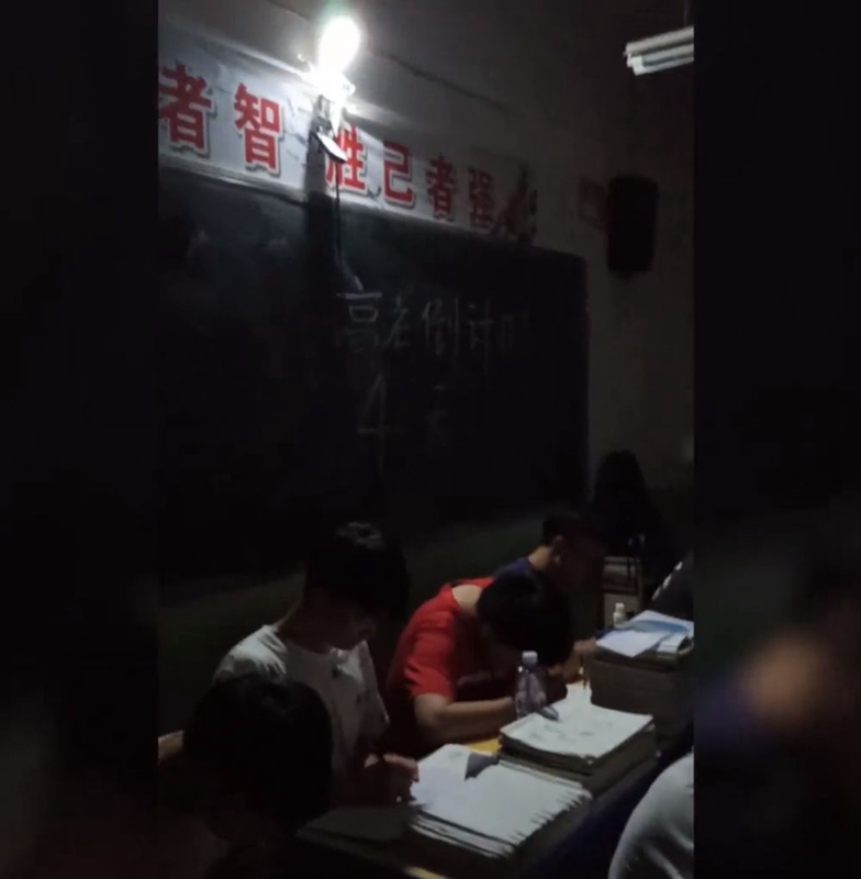 高三的學生們?yōu)樯贤碜粤?,?盞臺燈掛到教室前后的黑板上,繼續(xù)學習。數(shù)學老師雷忠霖感動流淚,記錄下了這一幕。