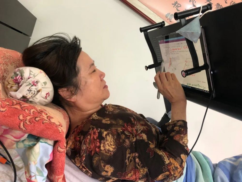 學校安排其他老師給李靖敏代課。半個月之后,6月中旬,北京再次出現(xiàn)新增病例,高三年級又重新回到線上教學。李靖敏提出,自己可以上網(wǎng)課。她把一個平板電腦靠著支架固定在身體上方,然后用手寫筆在觸摸屏上書寫、標記,這樣在家的學生就能同步看到。