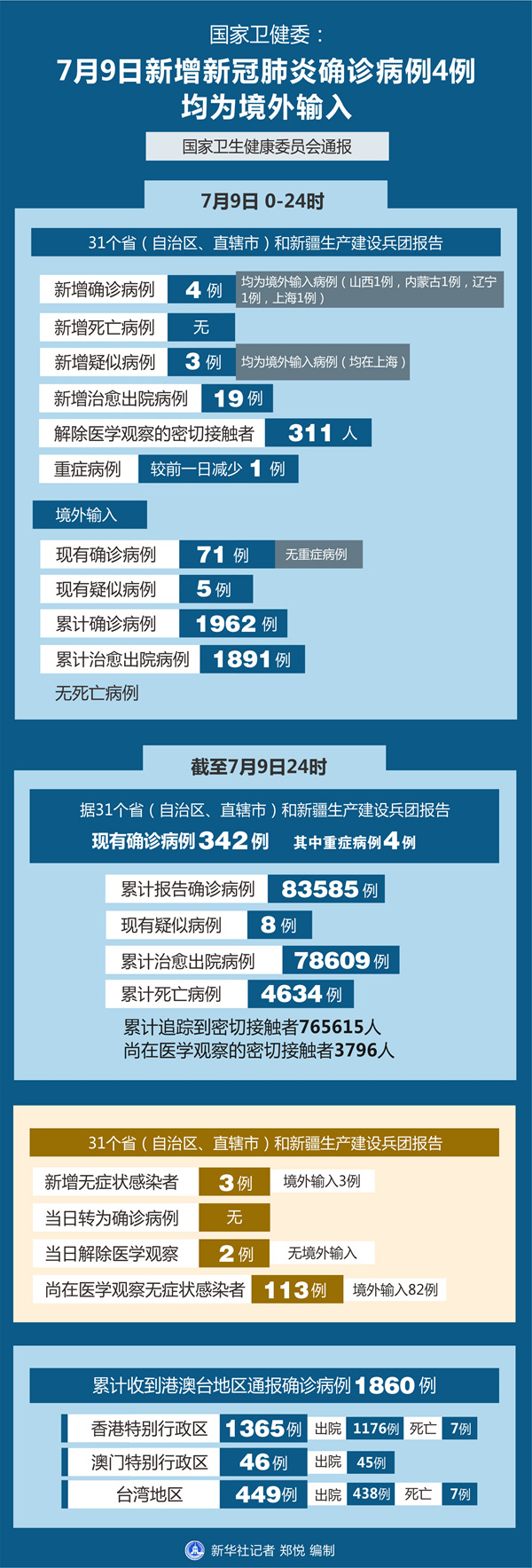 截至7月9日24時,據(jù)31個?。ㄗ灾螀^(qū)、直轄市)和新疆生產(chǎn)建設(shè)兵團報告,現(xiàn)有確診病例342例(其中重癥病例4例),累計治愈出院病例78609例,累計死亡病例4634例,累計報告確診病例83585例,現(xiàn)有疑似病例8例。累計追蹤到密切接觸者765615人,尚在醫(yī)學觀察的密切接觸者3796人。