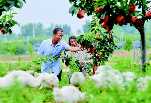 6月11日,李健(左)在桐柏縣埠江鎮(zhèn)付樓村黃金梨種植基地查看黃金梨套袋情況。本報(bào)記者郝源攝