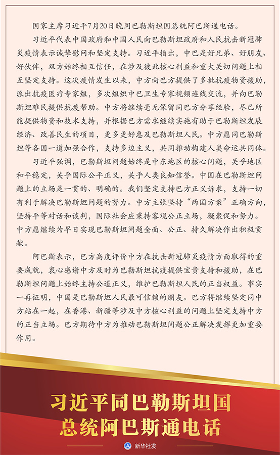 新華社北京7月20日電 國家主席習近平7月20日晚同巴勒斯坦國總統(tǒng)阿巴斯通電話。