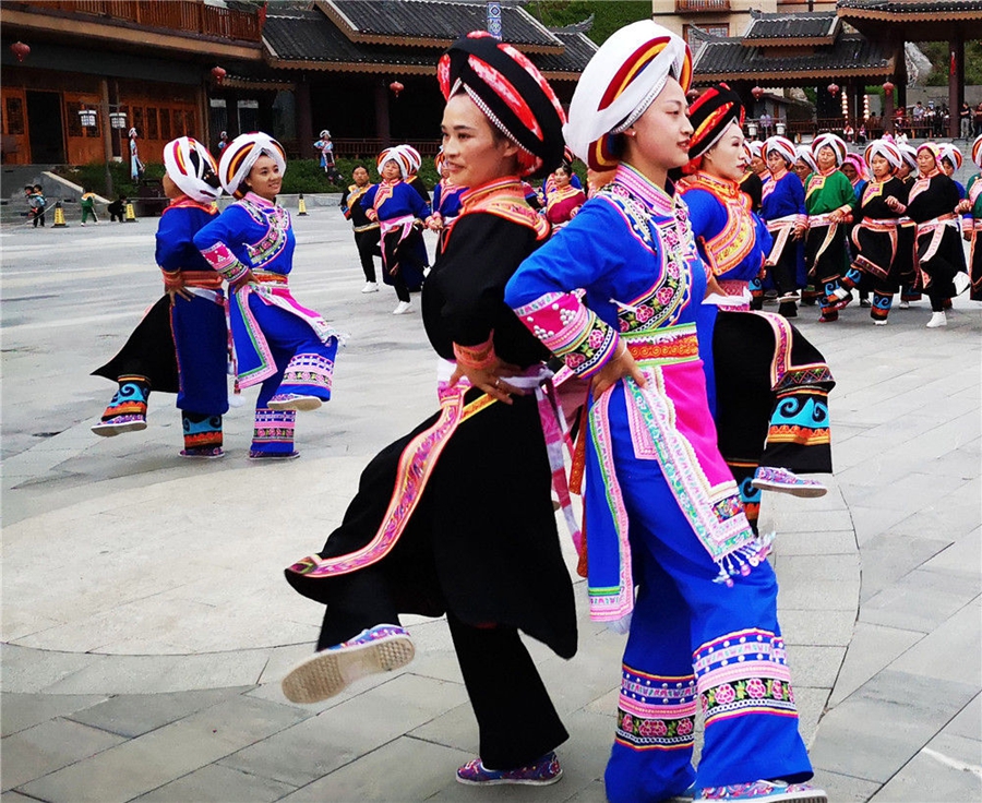 貴州省晴隆縣阿妹戚托藝術(shù)團(tuán)團(tuán)長文安梅(前左)在領(lǐng)舞(6月9日攝)。新華社記者 齊健 攝