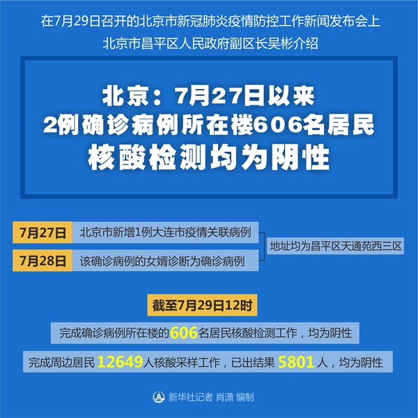 新華社北京7月29日電(記者陳旭)在29日召開的北京市新冠肺炎疫情防控工作新聞發(fā)布會(huì)上,北京市昌平區(qū)人民政府副區(qū)長吳彬介紹,27日以來2例大連市疫情關(guān)聯(lián)確診病例所在樓606名居民核酸檢測工作已完成,均為陰性。周邊居民12649人核酸采樣工作已出結(jié)果5801人,均為陰性。