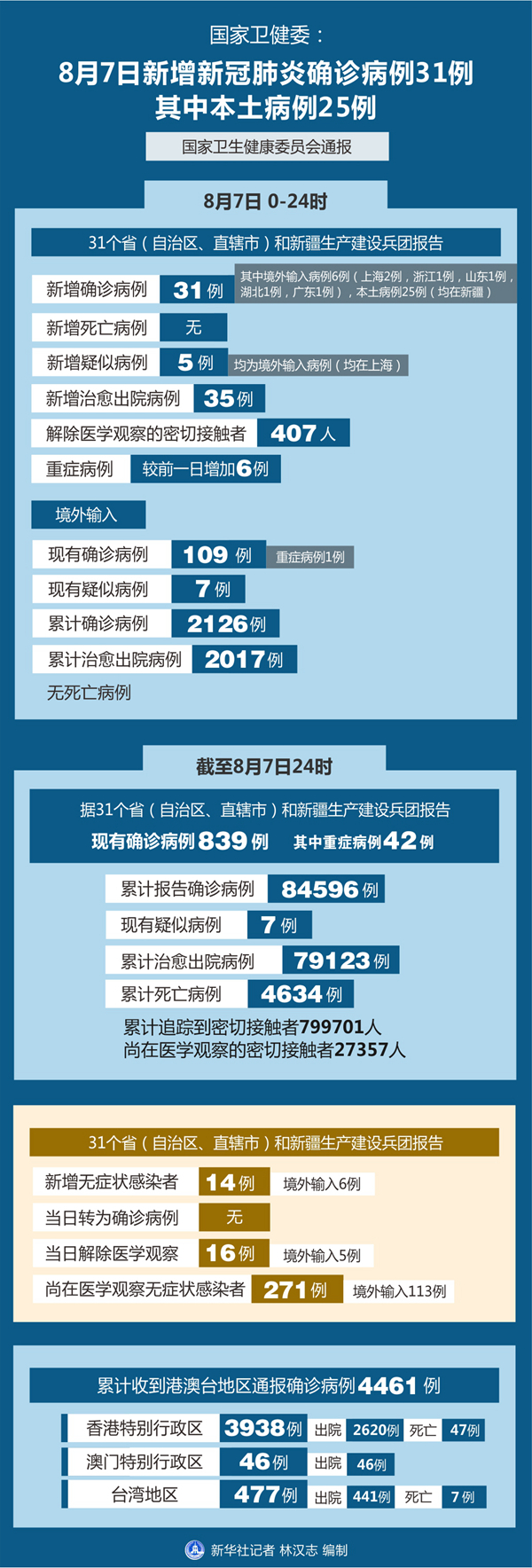 截至8月7日24時(shí),據(jù)31個?。ㄗ灾螀^(qū)、直轄市)和新疆生產(chǎn)建設(shè)兵團(tuán)報(bào)告,現(xiàn)有確診病例839例(其中重癥病例42例),累計(jì)治愈出院病例79123例,累計(jì)死亡病例4634例,累計(jì)報(bào)告確診病例84596例,現(xiàn)有疑似病例7例。累計(jì)追蹤到密切接觸者799701人,尚在醫(yī)學(xué)觀察的密切接觸者27357人。