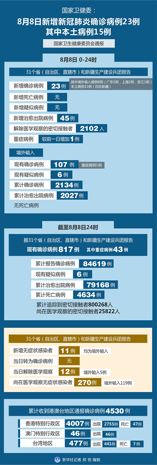 截至8月8日24時,據(jù)31個?。ㄗ灾螀^(qū)、直轄市)和新疆生產(chǎn)建設(shè)兵團報告,現(xiàn)有確診病例817例(其中重癥病例43例),累計治愈出院病例79168例,累計死亡病例4634例,累計報告確診病例84619例,現(xiàn)有疑似病例6例。累計追蹤到密切接觸者800268人,尚在醫(yī)學(xué)觀察的密切接觸者25822人。