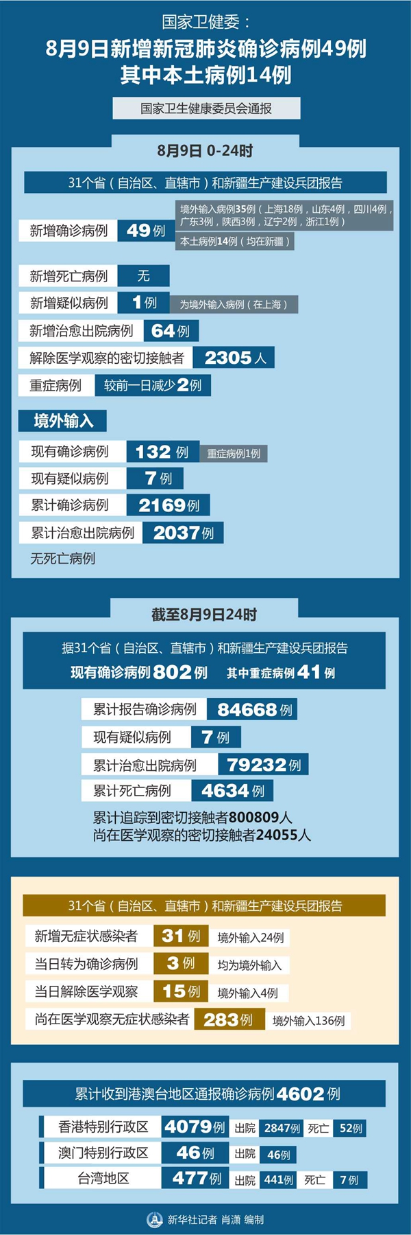 新華社北京8月10日電 國家衛(wèi)生健康委員會10日通報,8月9日0-24時,31個?。ㄗ灾螀^(qū)、直轄市)和新疆生產(chǎn)建設(shè)兵團(tuán)報告新增新冠肺炎確診病例49例,其中境外輸入病例35例(上海18例,山東4例,四川4例,廣東3例,陜西3例,遼寧2例,浙江1例),本土病例14例(均在新疆);無新增死亡病例;新增疑似病例1例,為境外輸入病例(在上海)。