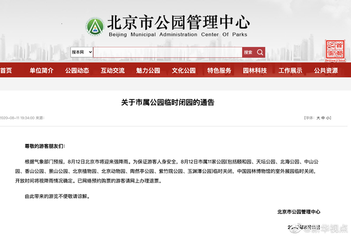北京市公園管理中心11日晚發(fā)布關(guān)于市屬公園臨時閉園的通告。通告稱,根據(jù)氣象部門預(yù)報,8月12日北京市將迎來強降雨。為保證游客人身安全,8月12日市屬11家公園(包括頤和園、天壇公園、北海公園、中山公園、香山公園、景山公園、北京植物園、北京動物園、陶然亭公園、紫竹院公園、玉淵潭公園)臨時關(guān)閉,中國園林博物館的室外展園臨時關(guān)閉,開放時間將視降雨情況確定。已網(wǎng)絡(luò)預(yù)約購票的游客請網(wǎng)上辦理退票。(記者魏夢佳)?