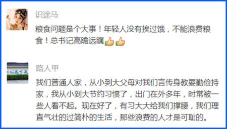 吃飯人人會,但怎么吃卻見境界。早在2013年,總書記在闡述糧食安全戰(zhàn)略時就告誡人們,“要牢記歷史,在吃飯問題上不能得健忘癥,不能好了傷疤忘了疼”。這次,總書記又強調,“盡管我國糧食生產(chǎn)連年豐收,對糧食安全還是始終要有危機意識”。對此,很多網(wǎng)友深表贊同,認為這些指示要言不煩、直指要害,我們決不能忘記餓肚子的歲月!