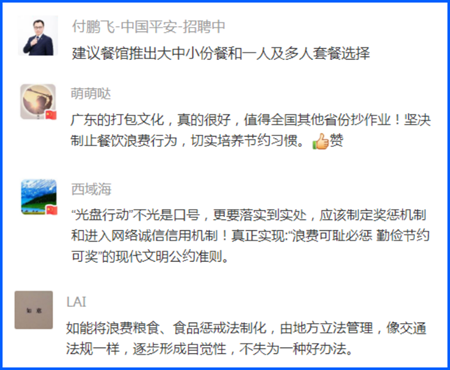 總書記強調,要加強立法,強化監(jiān)管,采取有效措施,建立長效機制,堅決制止餐飲浪費行為。網(wǎng)友們就此積極獻計獻策。