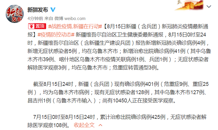 截至8月15日24時,新疆(含兵團(tuán))現(xiàn)有確診病例401例(危重癥9例、重癥25例),均為烏魯木齊市病例;現(xiàn)有無癥狀感染者128例,其中烏魯木齊市127例、昌吉州1例(烏魯木齊市輸入);尚有10450人正在接受醫(yī)學(xué)觀察。