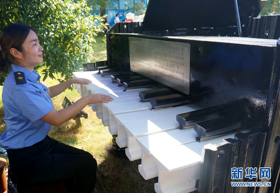 8月17日,向塘長(zhǎng)軌基地的工作人員在彈奏一架由廢舊鋼軌制作成的鋼琴。新華網(wǎng)記者劉瓊 攝