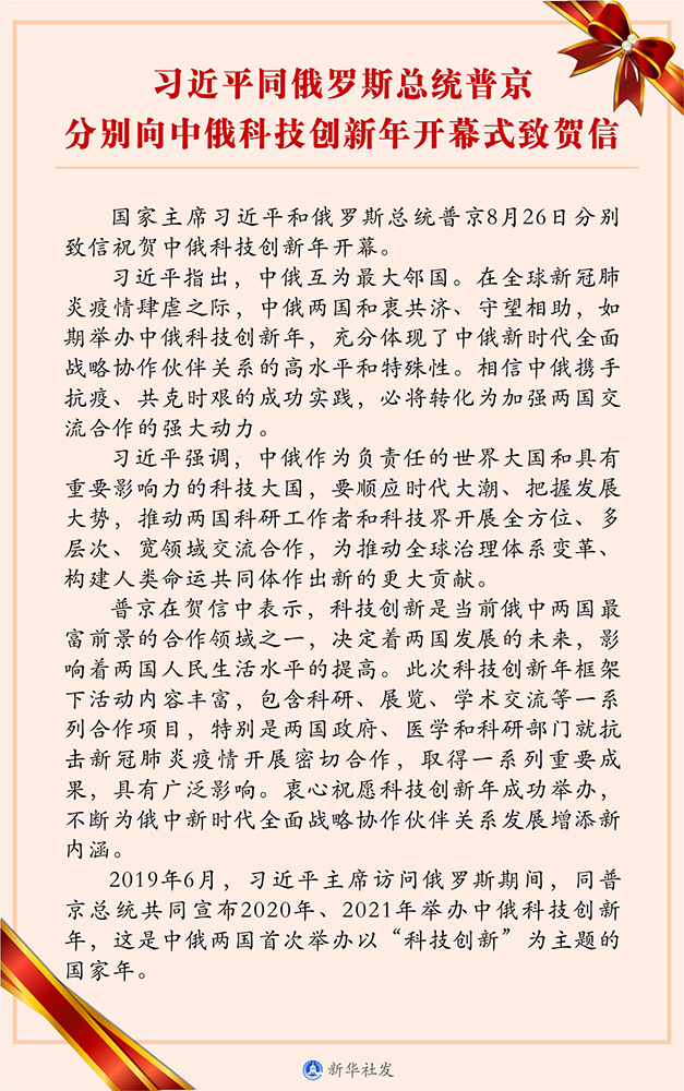 新華社北京8月26日電 國(guó)家主席習(xí)近平和俄羅斯總統(tǒng)普京26日分別致信祝賀中俄科技創(chuàng)新年開(kāi)幕。